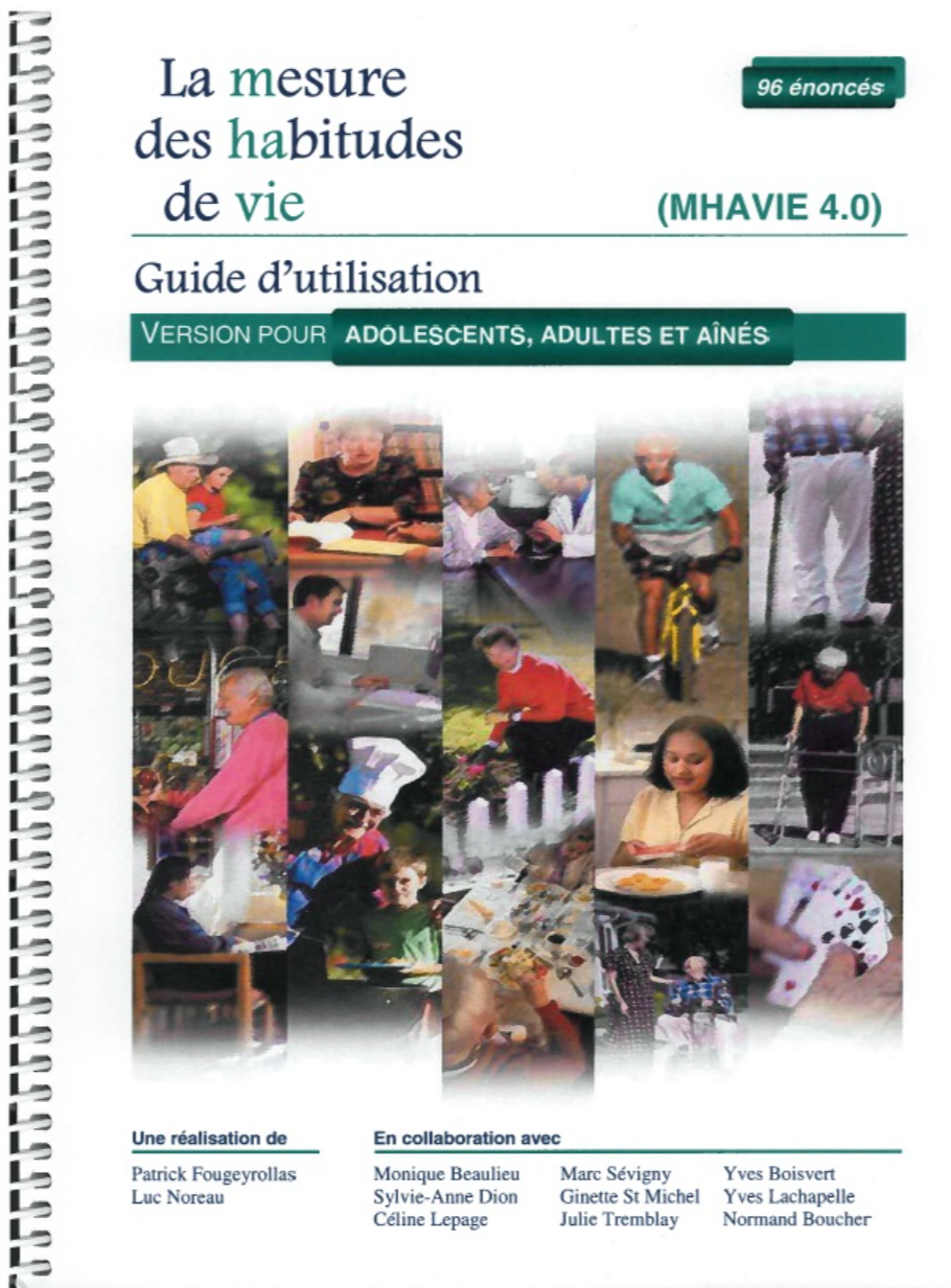 Ce guide d'utilisation permet de mesurer le niveau de participation sociale des adolescents, des adultes et des aînés. Le formulaire inclus dans ce guide contient 96 énoncés répartis entre douze 12 catégories d'habitudes de vie et de rôles sociaux. Pour chacun de ces énoncés, vous pourrez recueillir de l'information sur les dimensions associées au niveau de réalisation, aux types d'aide requis et au niveau de satisfaction.